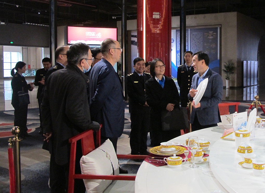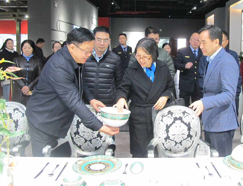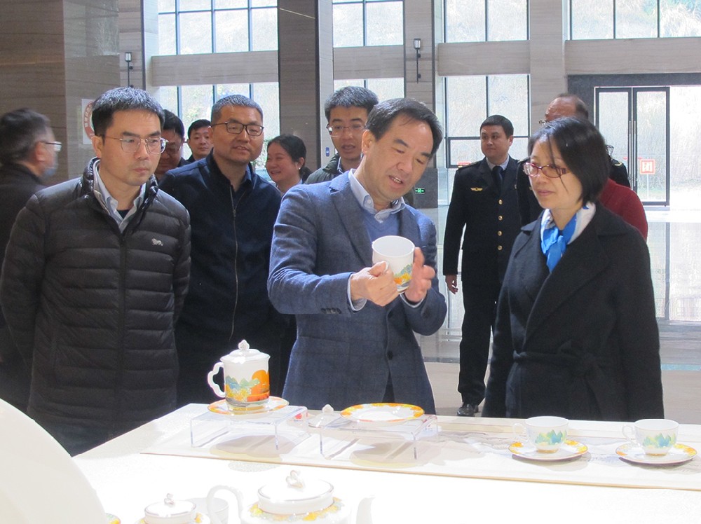 在國瓷館參觀考察期間,周敏建向調研組一行簡要介紹了集團公司發展歷程。大家邊走邊看,不時駐足拿起產品仔細品鑒或拍照。周敏建在介紹“國瓷紅葉”產品特色時詳細講解了陶瓷生產工藝,講述了一套套有關“國瓷”的故事。